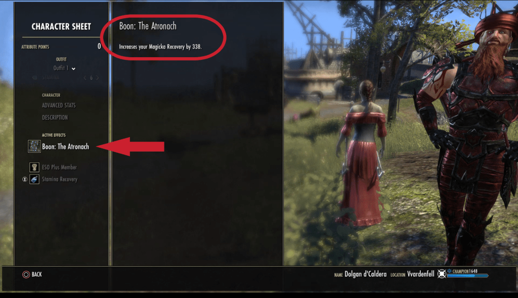 To check if you have a Mundus Stone effect active, simply navigate to the character stat page. Under the “active effects” section it should say “Boon: the specific stone you chose”. On this character I have The Atronach Mundus Stone active.