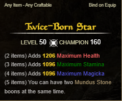While we are on the subject of gear, lets also mention the Twice-Born Star set. This set gives your character the ability to have two active Mundus Stones at the same time. This is the only way to have more than one Mundus Stone attached to your character. However, this set should only be worn as jewelry and armor, because if you have this on the weapons (front barred) and switch to a different weapon (Maelstrom/Black Rose Prison/etc.) on the back bar, your second Mundus Stone will fall off. If this happens you will have to reactivate it at the Mundus Stone. This would be impossible to do in an instanced zone such as a trial or group dungeon.